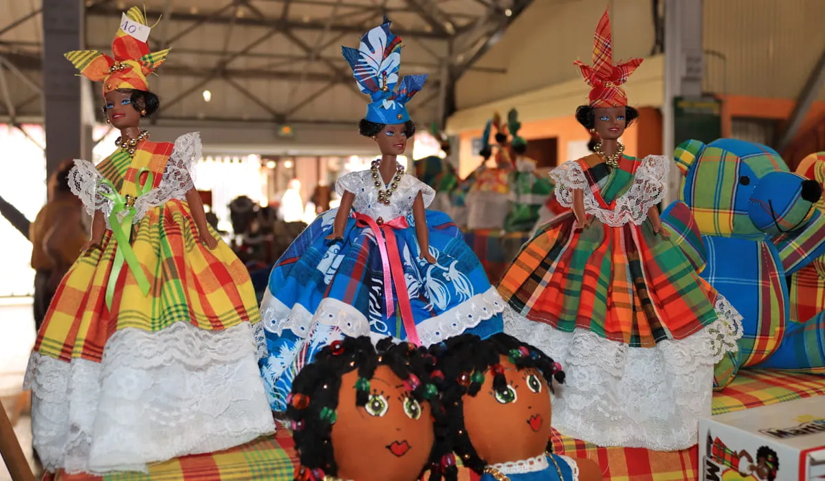In her home, a Martinican woman has assembled an impressive collection of dolls and opened La Maison de la Poupée (Doll's House). It's been renamed Madin'Dolls. She created all the outfits—made of fabric or banana leaves—to illustrate the wardrobe of Creole women according to different occasions, social statuses, and professions. Some of the dolls in the collection are available for purchase.